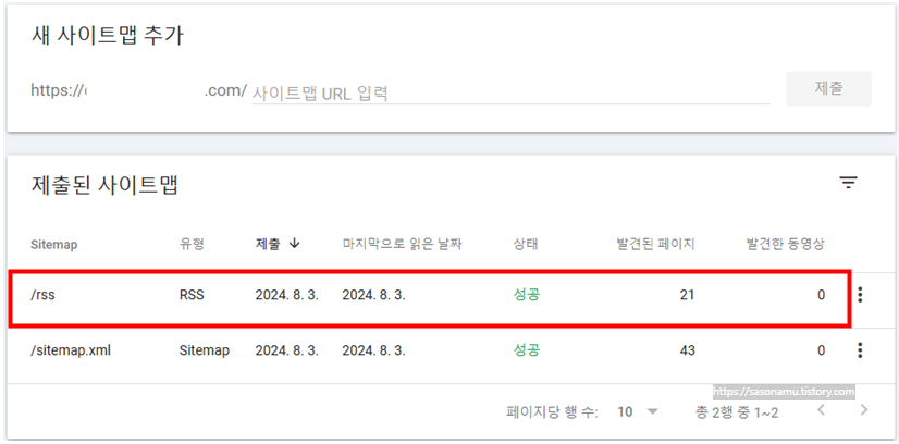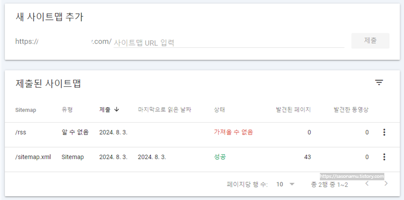 8월 3일 사이트맵과 rss를 제출했고, 하루 지난 뒤 다시 들어가 봤더니 rss의 '가져올 수 없음'이 '성공'으로 바뀐 것을 확인했습니다.
