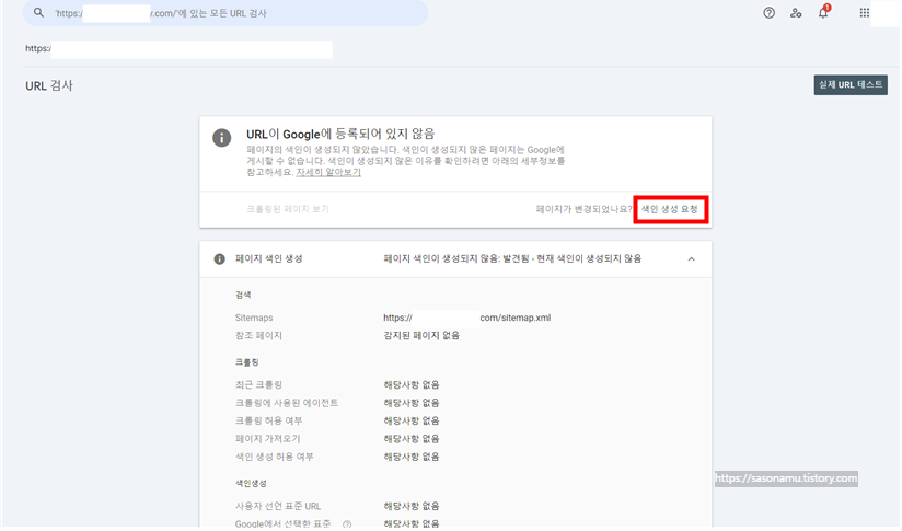 URL이 등록되어 있지 않다고 뜨면 '색인 생성 요청' 버튼을 클릭하여 구글에 색인을 요청합니다.