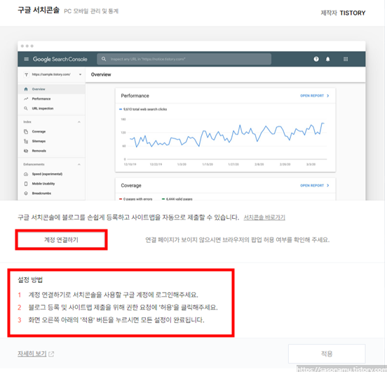 다시 블로그 홈으로 돌아와 플러그인 → 구글 서치콘솔 → 계정 연결하기 → 적용 순으로 진행하여 구글 서치콘솔과 내 계정을 연결해 줍니다.