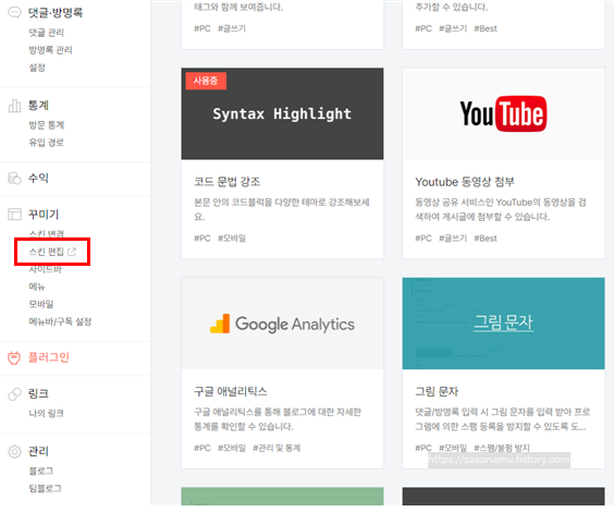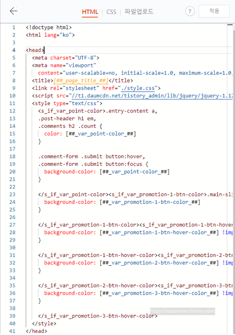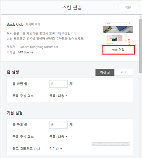 스킨편집 → html 편집 → 코드삽입 → 적용 순으로 진행됩니다.