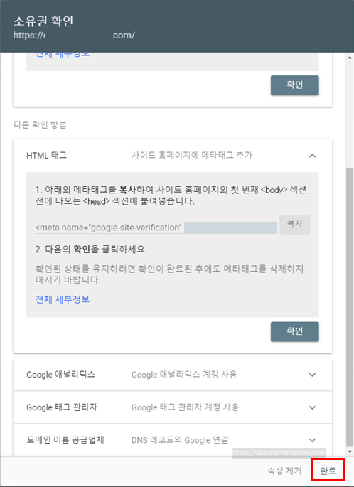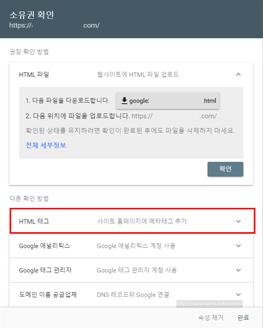 사이트 등록 후, 소유권을 확인하라는 창이 이렇게 뜨는데요.
