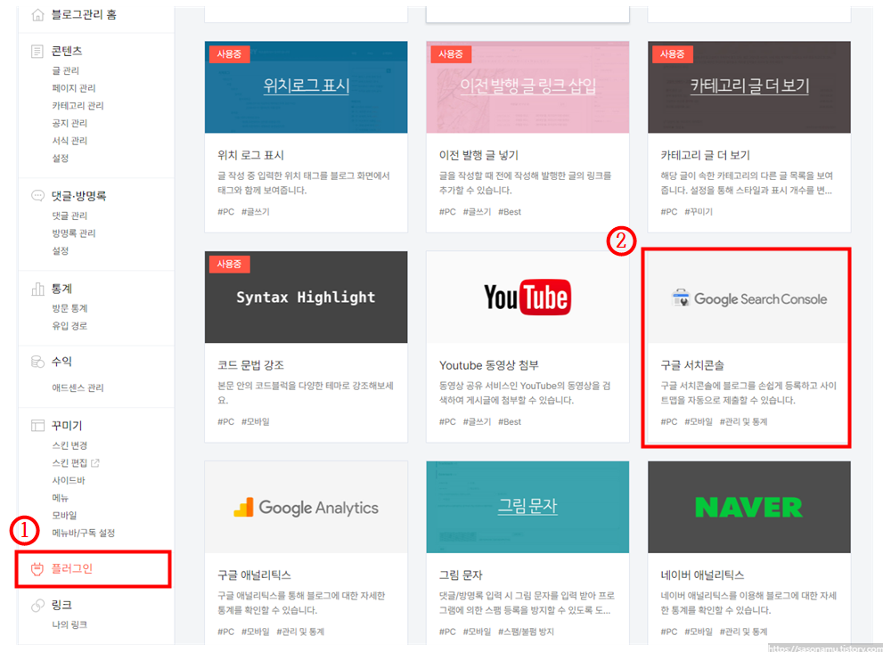 구글 서치콘솔은 블로그 관리 홈 → 플러그인 → 구글 서치콘솔을 통해 계정을 연결할 수 있습니다.