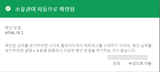 소유권 확인창의 완료를 클릭하면 소유권이 확인되었다는 창이 뜹니다.