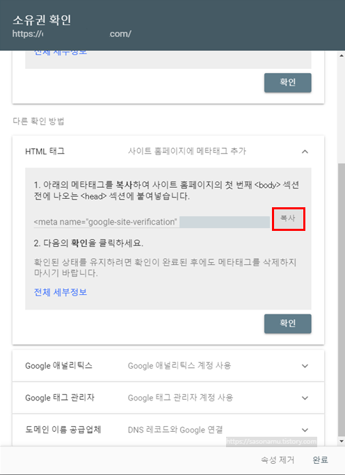 여기서 복사를 눌러 메타태그를 복사합니다.
