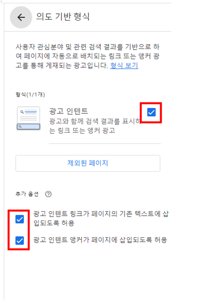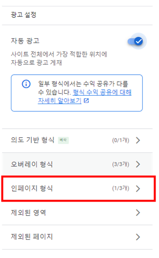 인페이지 형식 → 형식 전체선택 → 자동 광고 수 최대로 변경