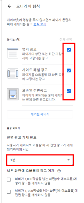 오버레이 형식 → 전면광고 게재 빈도 1분으로 변경