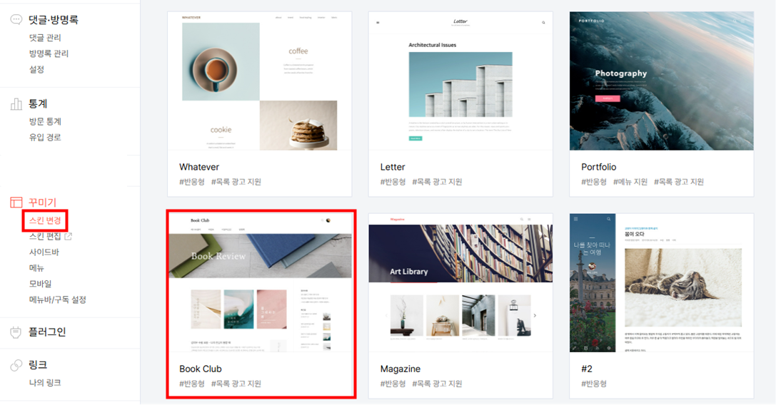 Book Club 스킨을 클릭하여 적용을 눌러줍니다. Book Club 스킨이 AI에 최적화되어 있다는 이야기가 있습니다.