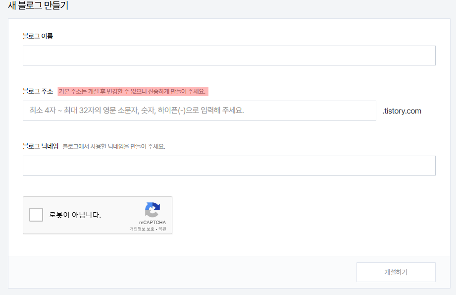 사용할 블로그 이름, 블로그 주소, 블로그 닉네임을 차례로 기입하여 준 후 로봇이 아닙니다를 체크하여 개설하기를 눌러줍니다.