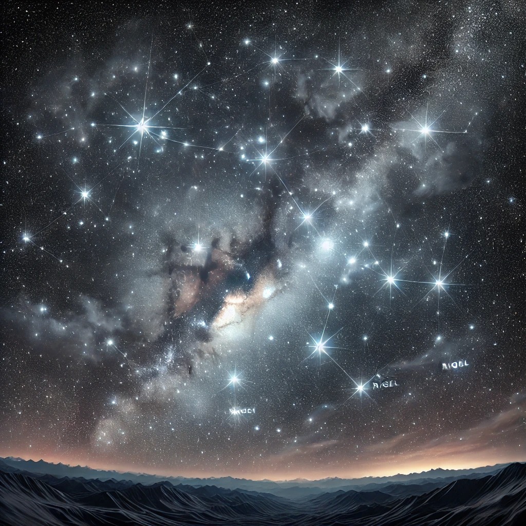 - 리겔 (Rigel): 청백색 초거성으로, 오리온의 오른쪽 다리에 위치해 있습니다. 이 별은 약 860광년 떨어져 있으며, 매우 밝게 빛납니다. 리겔은 은하수에서 가장 밝은 별 중 하나로, 천문학자들이 별의 밝기를 측정할 때 자주 참조하는 별입니다.