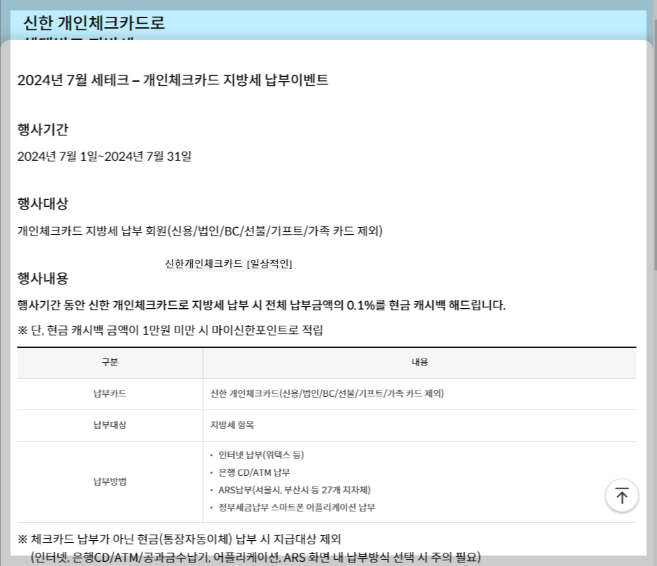 신한카드는 모든 개인 체크카드로 지방세 납부 시 전체 납부합간금액의 0.1%를 캐시백하는 이벤트를 진행 중입니다.