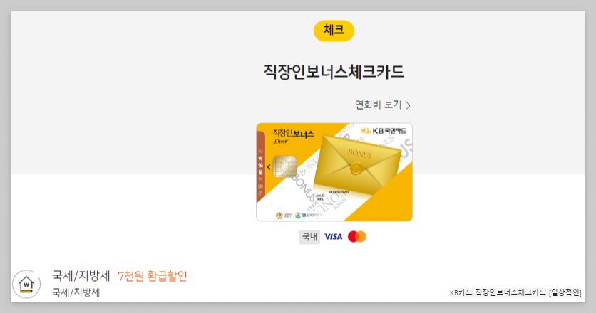 KB국민카드의 직장인보너스체크카드는 국세/지방세에 대해 건당 10만 원 이상 시 7천 원을 캐시백해줍니다.